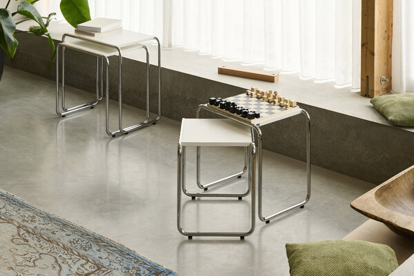 Eines der ersten Meisterwerke: der Hocker B 9 H. Ursprünglich für die Kantine des Dessauer Bauhaus-Gebäudes entworfen, entwickelte er sich schnell zum vielseitigen Satztisch-Set B 9. Ein Designklassiker, der bis heute in der Thonet-Kollektion lebt – zeitlos, funktional und ikonisch.