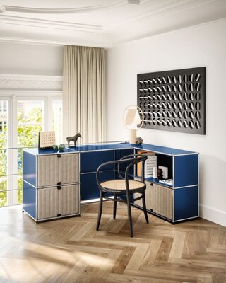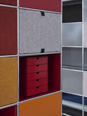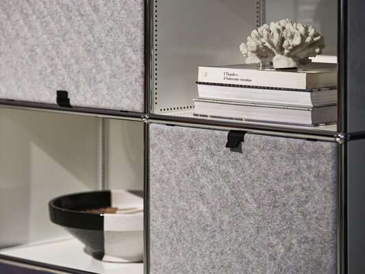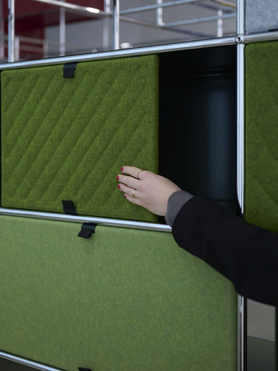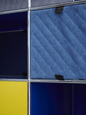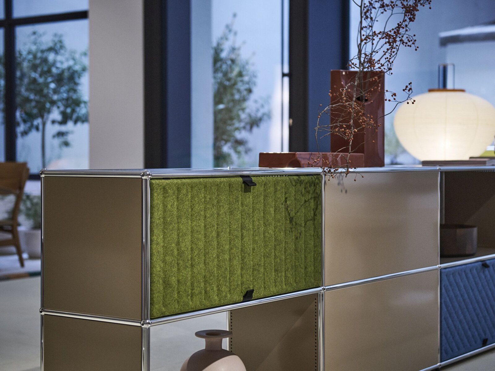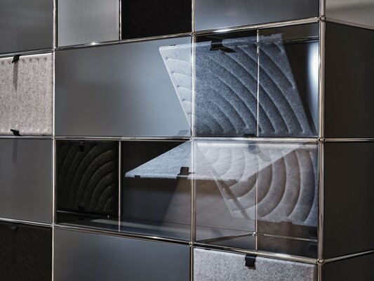 Das USM Haller Soft Panel ist gefertigt aus hochwertiger Kunstfaser, mit einem Anteil von 40% an rezykliertem Seaqual® Fibres Meeresplastik. Leicht, stabil und gewohnt langlebig. Weich in der Haptik und warm in der Ästhetik – ein überraschender Kontrast in der metallenen Welt des Klassikers. Noch eine Besonderheit: Die Panels dämpfen Geräusche und verbessern die Raumakustik. Typisch USM: Design, Funktionalität und Nachhaltigkeit in Symbiose.